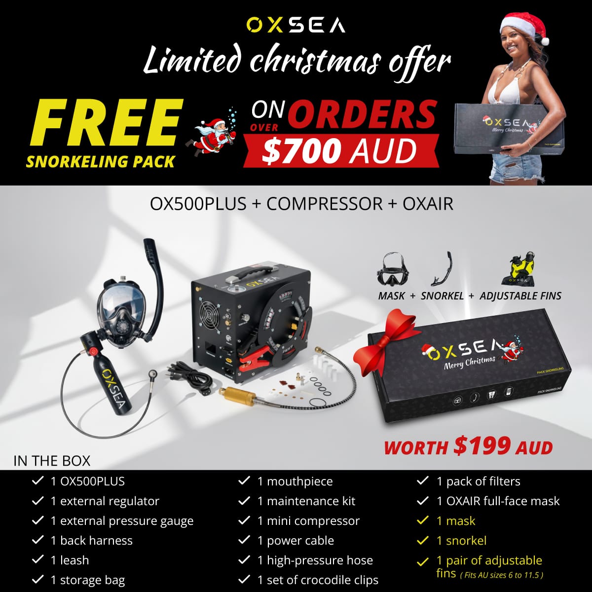 designed for explorers who value simplicity, safety, and control. This pack includes the OXSEA Mini Compressor and the OXAIR mask.