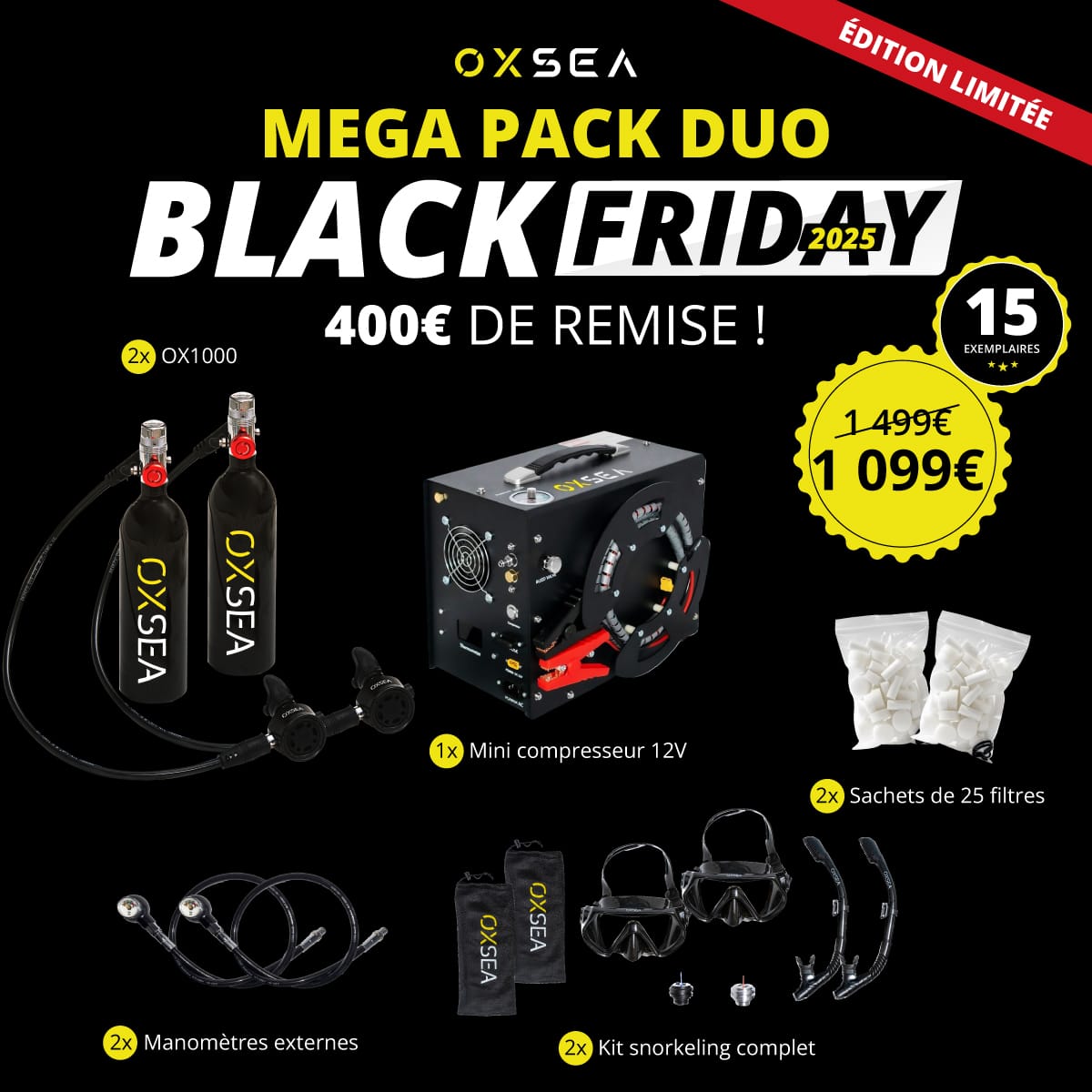 MEGA PACK DUO OX1000 Black Friday : la configuration ultime pour intervenir sous l’eau à deux, sans compromis.