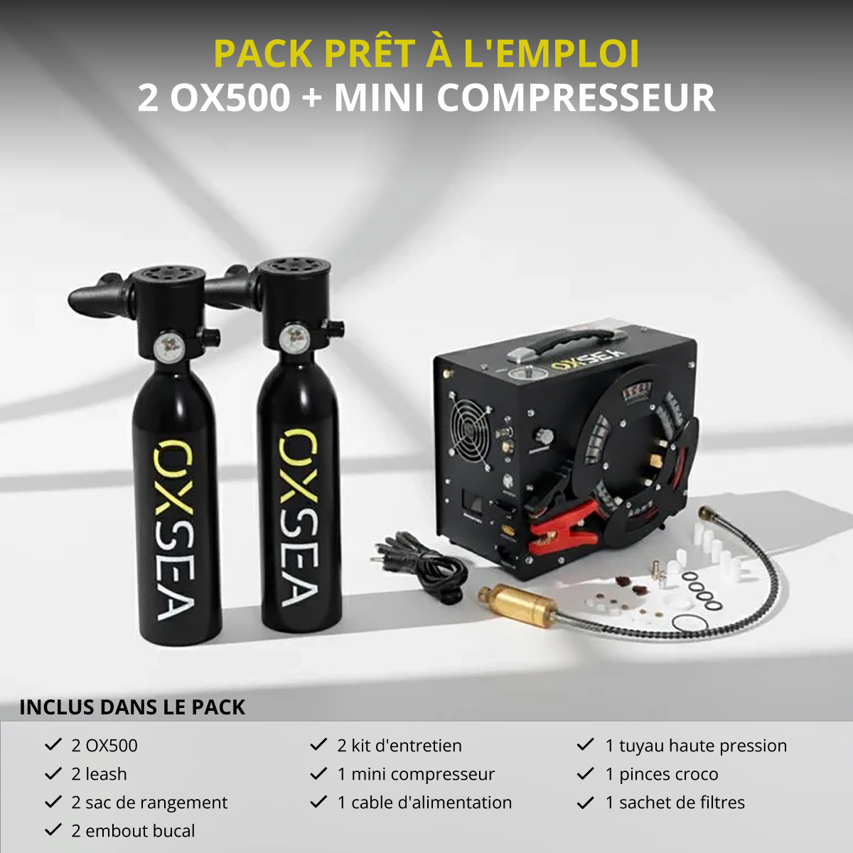 Découvrez le Pack OX500 DUO: deux mini-bouteilles + mini compresseur.