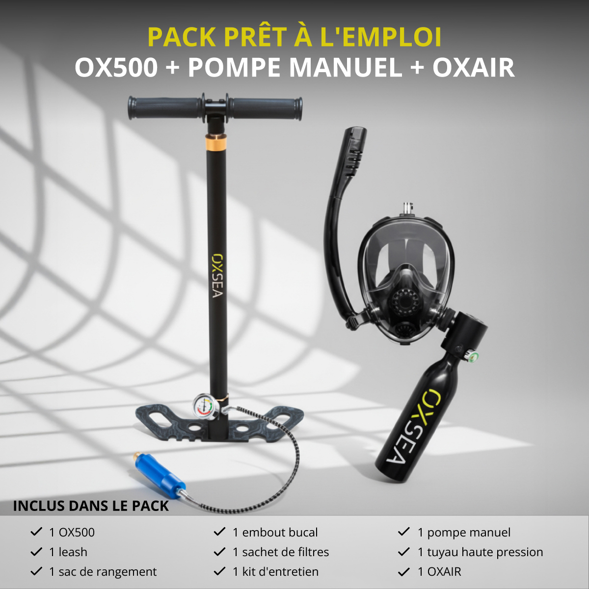 La OX500 offre jusqu’à 8 minutes d’autonomie avec 0,5 L. Ce pack inclut la pompe manuelle OXSEA et le masque OXAIR pour des sessions fluides entre surface et immersion.