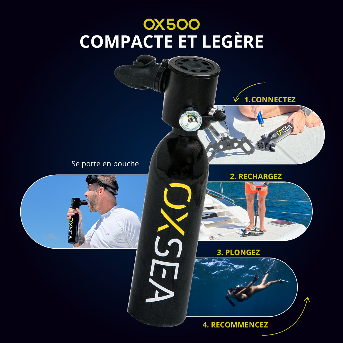La OX500 offre jusqu’à 8 minutes d’autonomie avec sa capacité de 0,5 L. Ce pack inclut la pompe manuelle OXSEA pour recharger partout, pensé pour simplicité, sécurité et liberté.