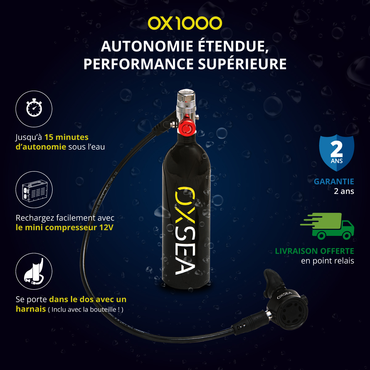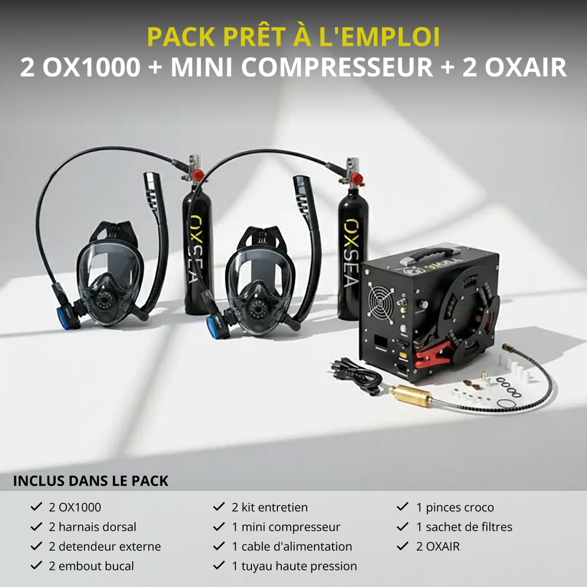 Chaque OX1000 délivre jusqu’à 15 minutes d’autonomie avec 1,0 L. Le pack DUO inclut deux mini-bouteilles, le mini compresseur OXSEA et deux masques OXAIR.