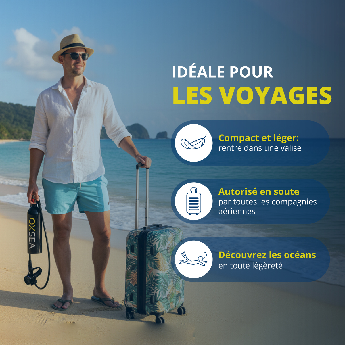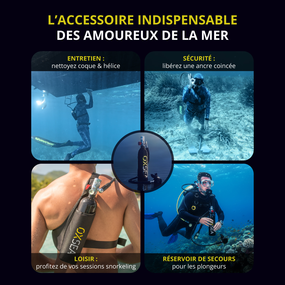 Chaque OX1000 offre jusqu’à 15 minutes d’autonomie avec 1,0 L. Ce pack DUO inclut deux mini-bouteilles et le mini compresseur OXSEA pour recharges rapides en 12V ou 220V.