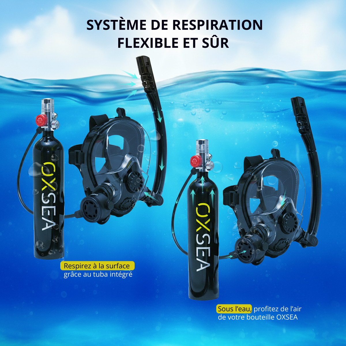 La OX1000 délivre jusqu’à 15 minutes d’autonomie avec 1,0 L. Ce pack inclut le mini compresseur OXSEA et le masque OXAIR pour une expérience fluide entre surface et immersion.
