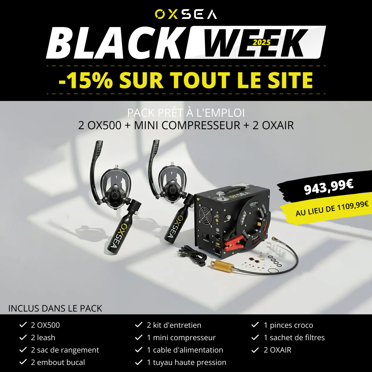 Chaque OX500 offre jusqu’à 8 minutes d’autonomie avec 0,5 L. Le pack DUO inclut deux mini-bouteilles, le mini compresseur OXSEA et deux masques OXAIR.