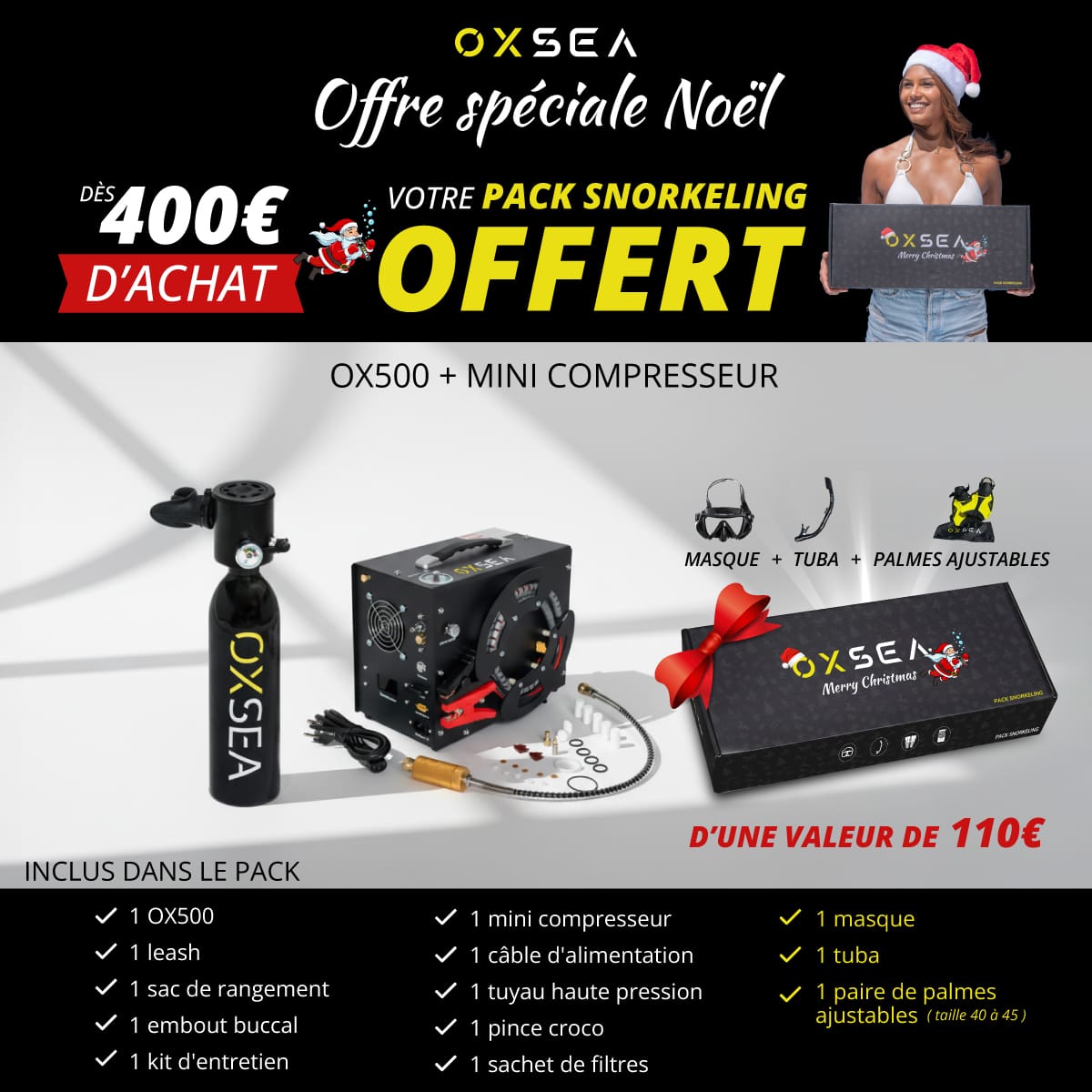 La OX500 offre jusqu’à 8 minutes d’autonomie avec 0,5 L. Ce pack inclut le mini compresseur OXSEA pour des recharges rapides en 12V ou 220V.