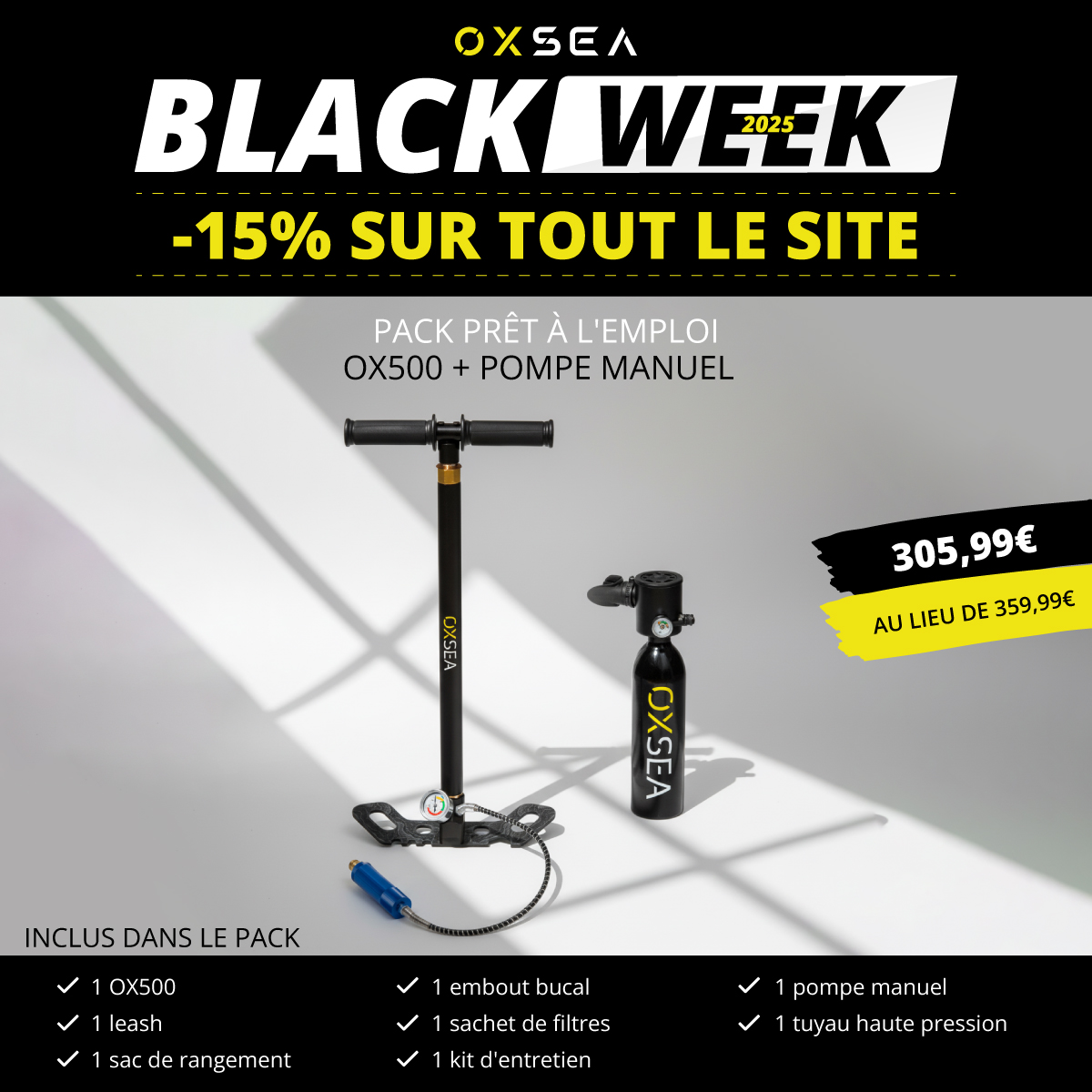 La OX500 offre jusqu’à 8 minutes d’autonomie avec sa capacité de 0,5 L. Ce pack inclut la pompe manuelle OXSEA pour recharger partout, pensé pour simplicité, sécurité et liberté.