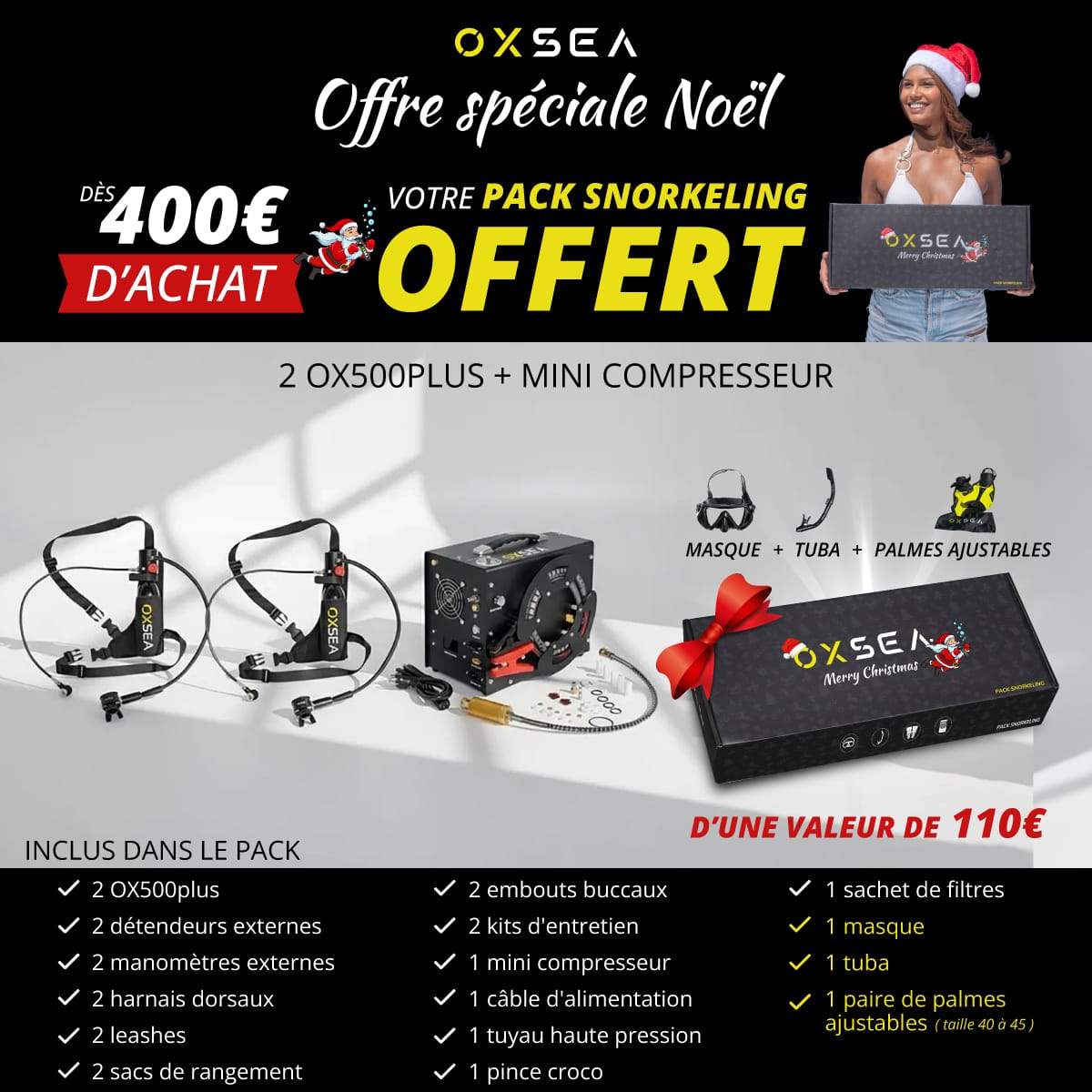 Chaque OX500 PLUS offre jusqu’à 8 minutes d’autonomie avec 0,5 L. Ce pack DUO inclut deux mini-bouteilles et le mini compresseur OXSEA.