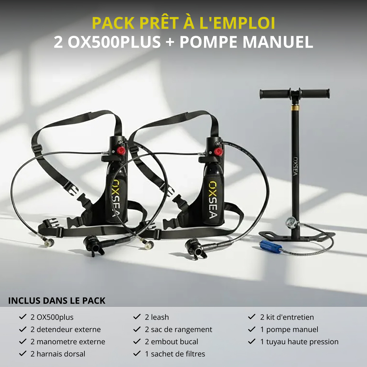 Chaque OX500 PLUS offre jusqu’à 8 minutes d’autonomie avec 0,5 L. Ce pack DUO inclut deux mini-bouteilles et la pompe manuelle OXSEA pour recharger partout, pensé pour simplicité, sécurité et contrôle.