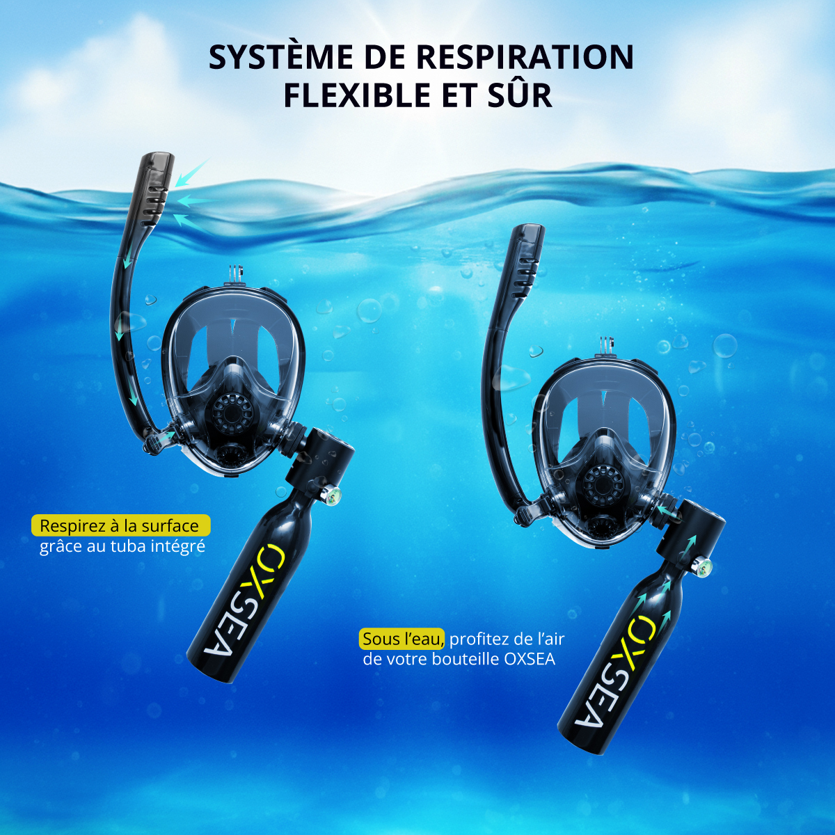 La OX500 PLUS offre jusqu’à 8 minutes d’autonomie avec 0,5 L. Ce pack inclut le mini compresseur OXSEA et le masque OXAIR pour une expérience surface immersion cohérente.