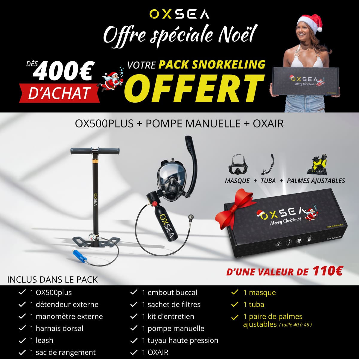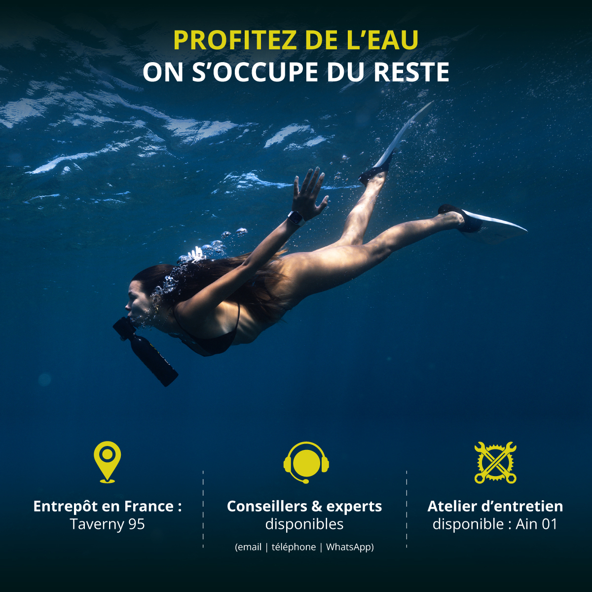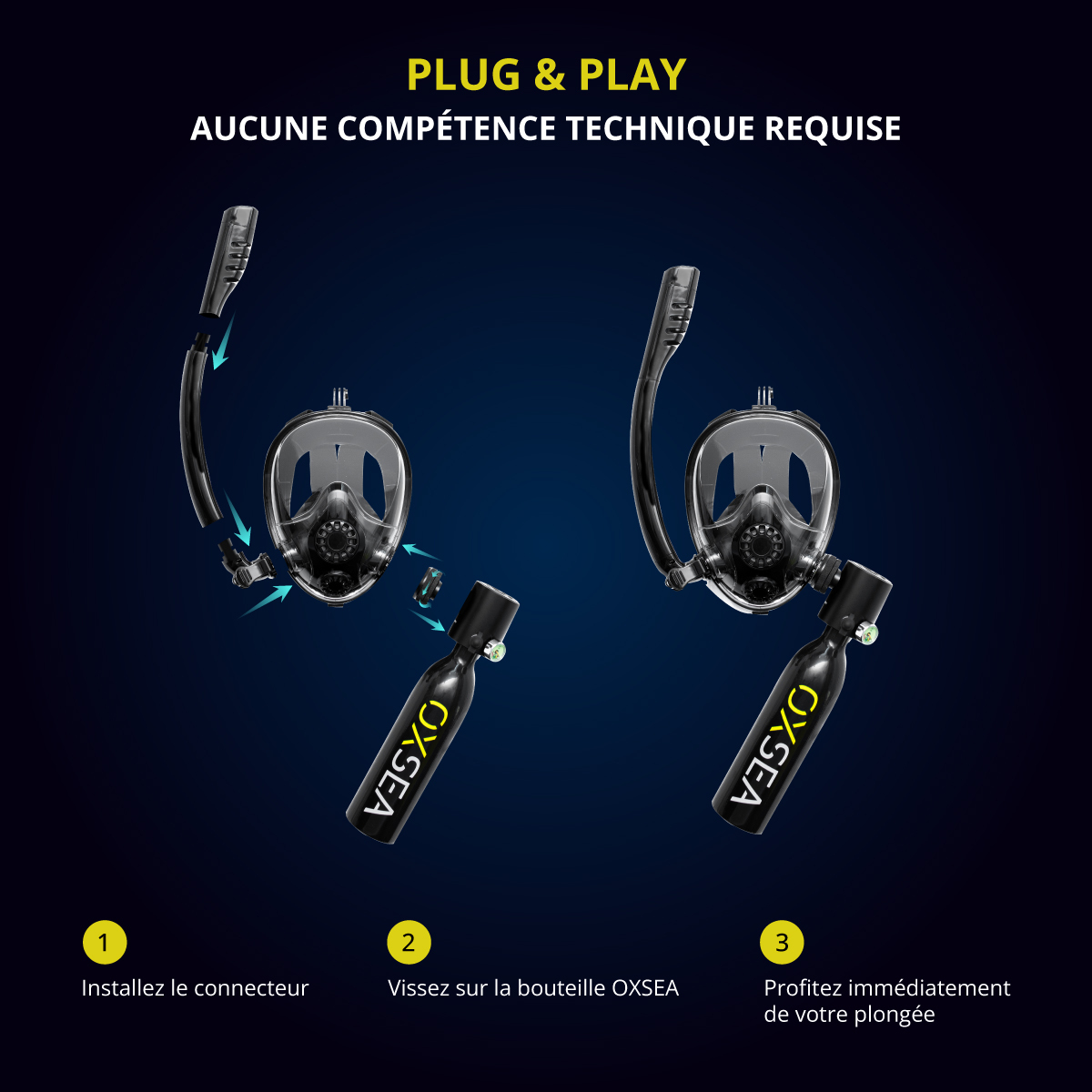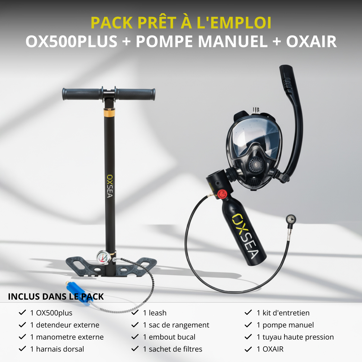 La OX500 PLUS offre jusqu’à 8 minutes d’autonomie avec 0,5 L. Ce pack inclut la pompe manuelle OXSEA et le masque OXAIR pour des sessions surface immersion fluides.
