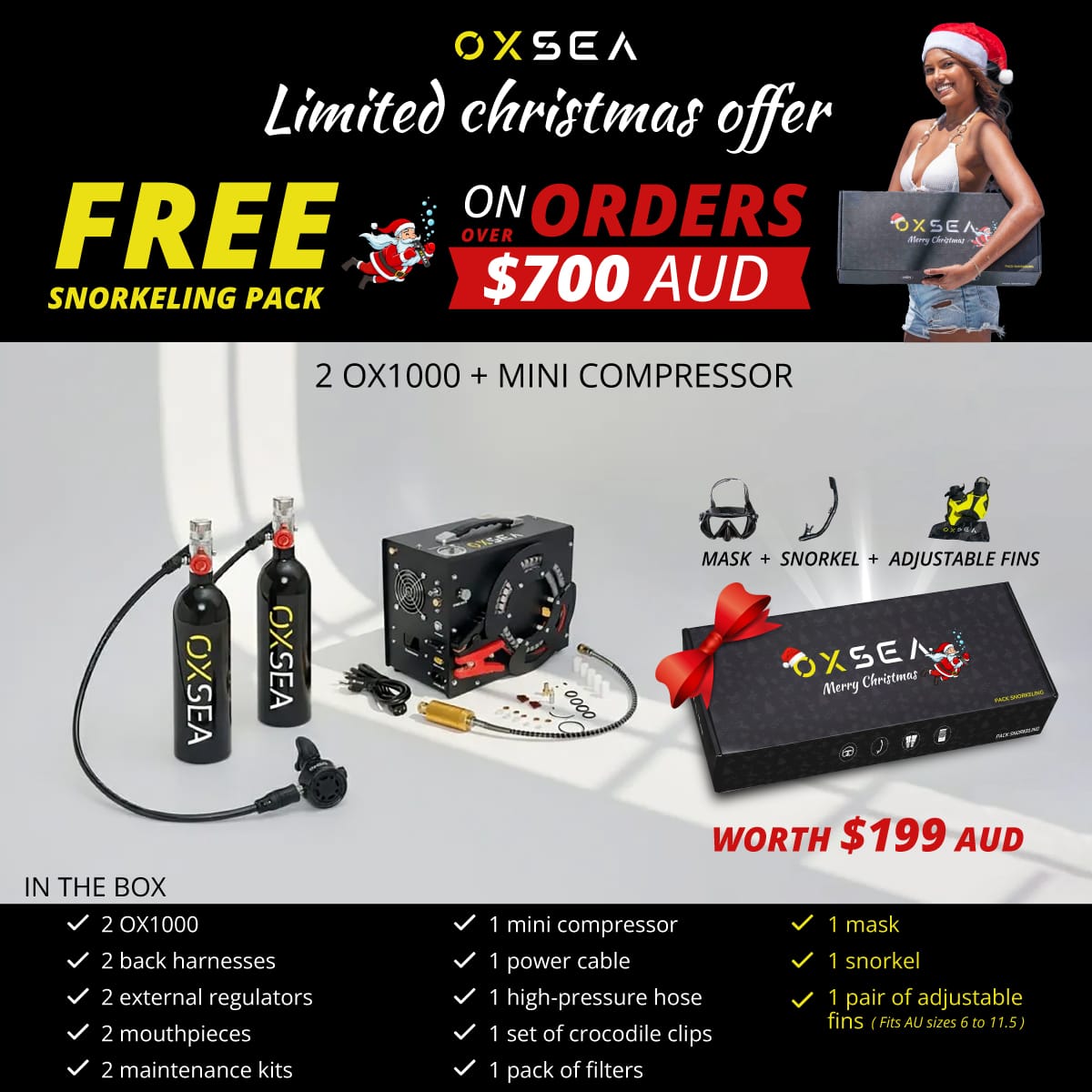 designed for explorers who value range, safety, and freedom. This DUO pack includes two OX1000 tanks and the OXSEA Mini Compressor.