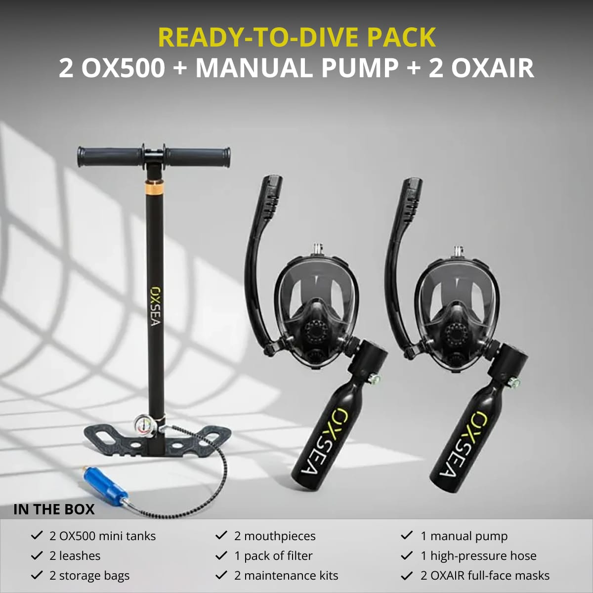 and this DUO pack includes two OX500 mini tanks, one OXSEA Hand Pump, and two OXAIR masks so you can refill anywhere and enjoy comfort around the water, designed for simplicity, safety, and freedom.