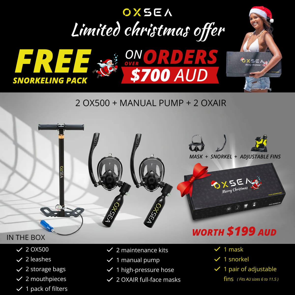 and this DUO pack includes two OX500 mini tanks, one OXSEA Hand Pump, and two OXAIR masks so you can refill anywhere and enjoy comfort around the water, designed for simplicity, safety, and freedom.