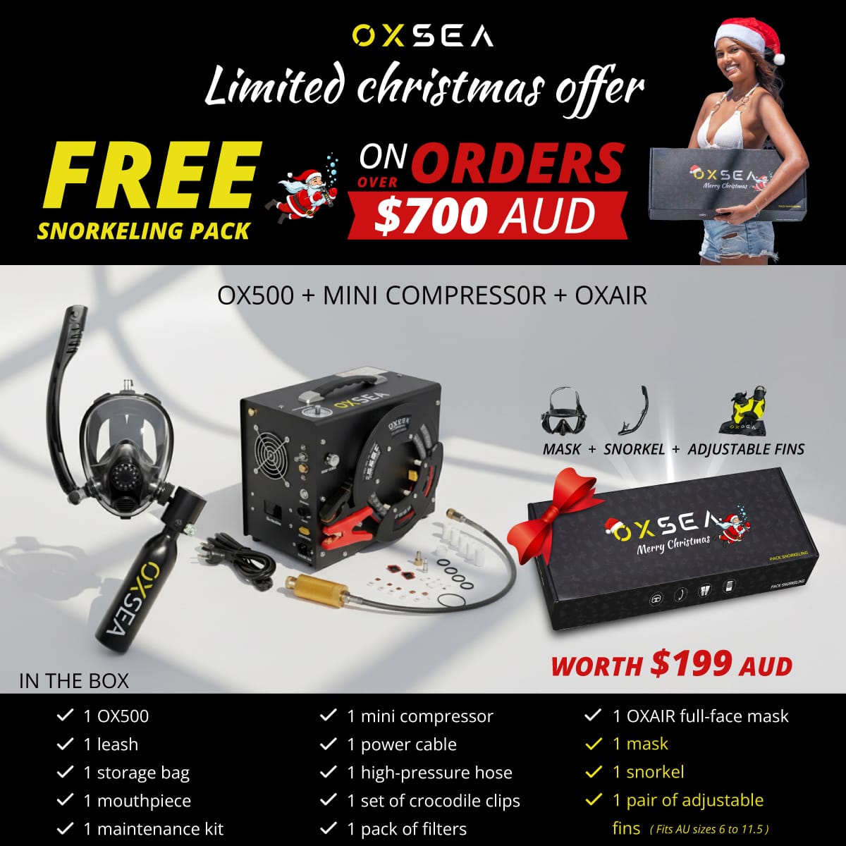 designed for explorers who value simplicity, safety, and freedom. This pack includes the OXSEA Mini Compressor and the OXAIR mask.
