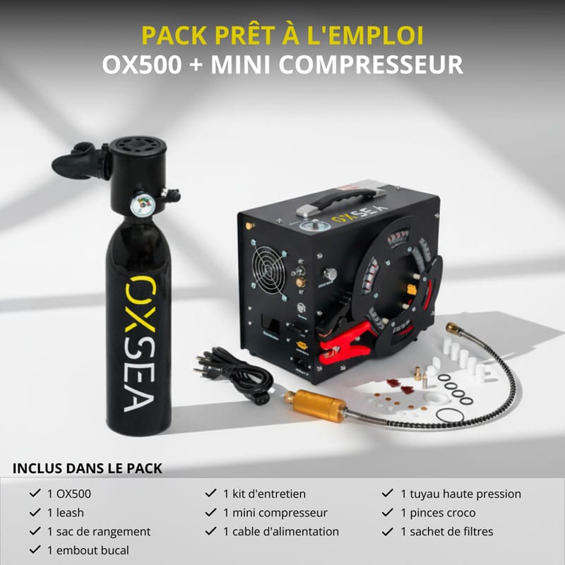 The OX500 offers up to 8 minutes of dive time with 0.5 L. This pack includes the OXSEA mini compressor for quick recharges in 12V or 220V.