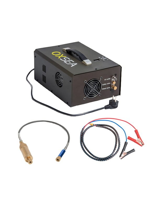The Oxsea mini compressor delivers a pressure of 300 bars, allowing you to fill your OX500 and OX500Plus tanks in approximately 12 minutes and your OX1000 tanks in approximately 20 minutes. With its crocodile clip connectors and built-in 110V/220V converter, you can effortlessly refill your Oxsea tanks directly from a car or boat battery, or a standard power outlet.